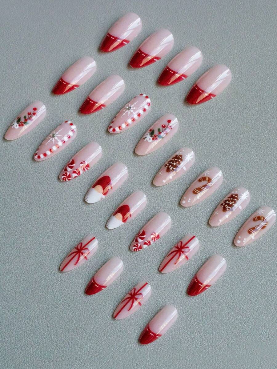 24pcs Almond Christmas Press On Nails, Red Santa Hat Short False Nails, Holiday Nail Set For Women, Office, Date, Party & Everyday Wear