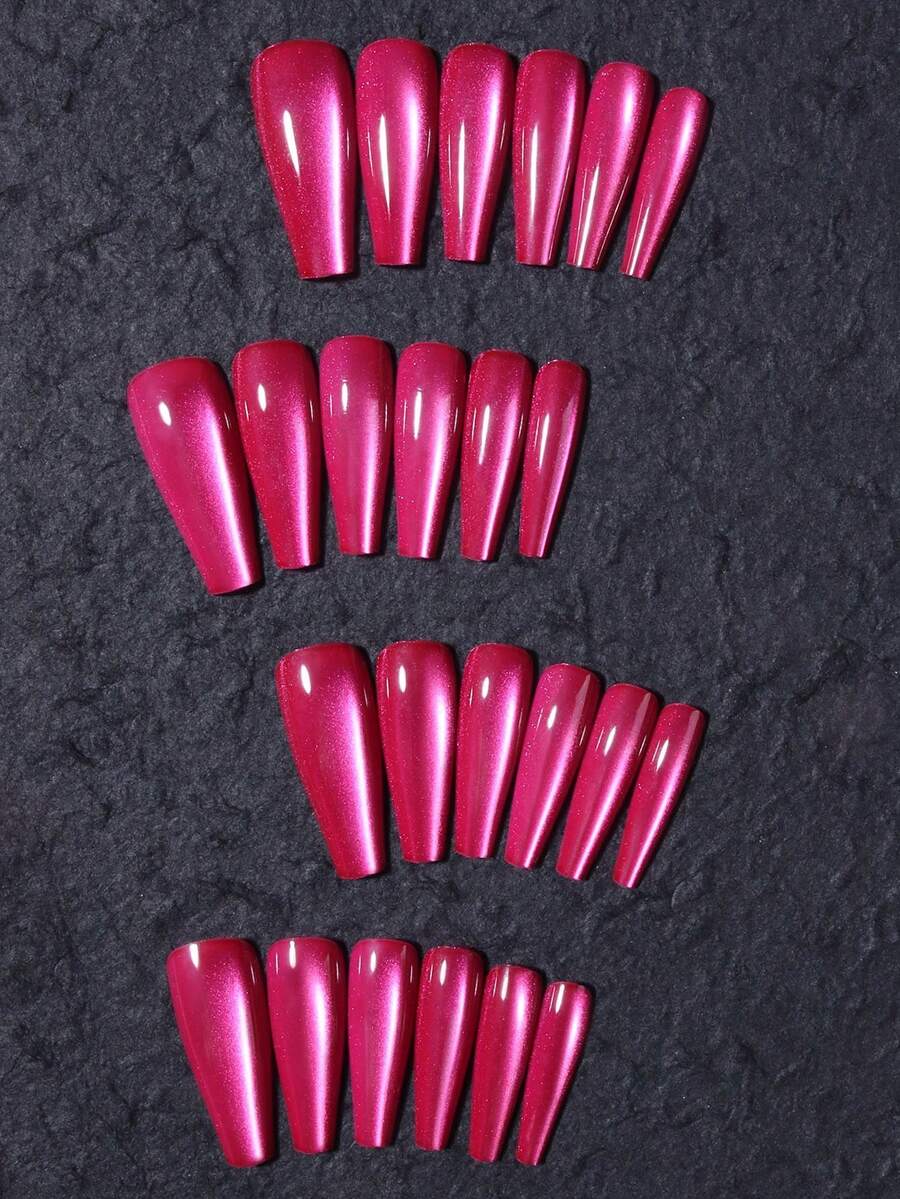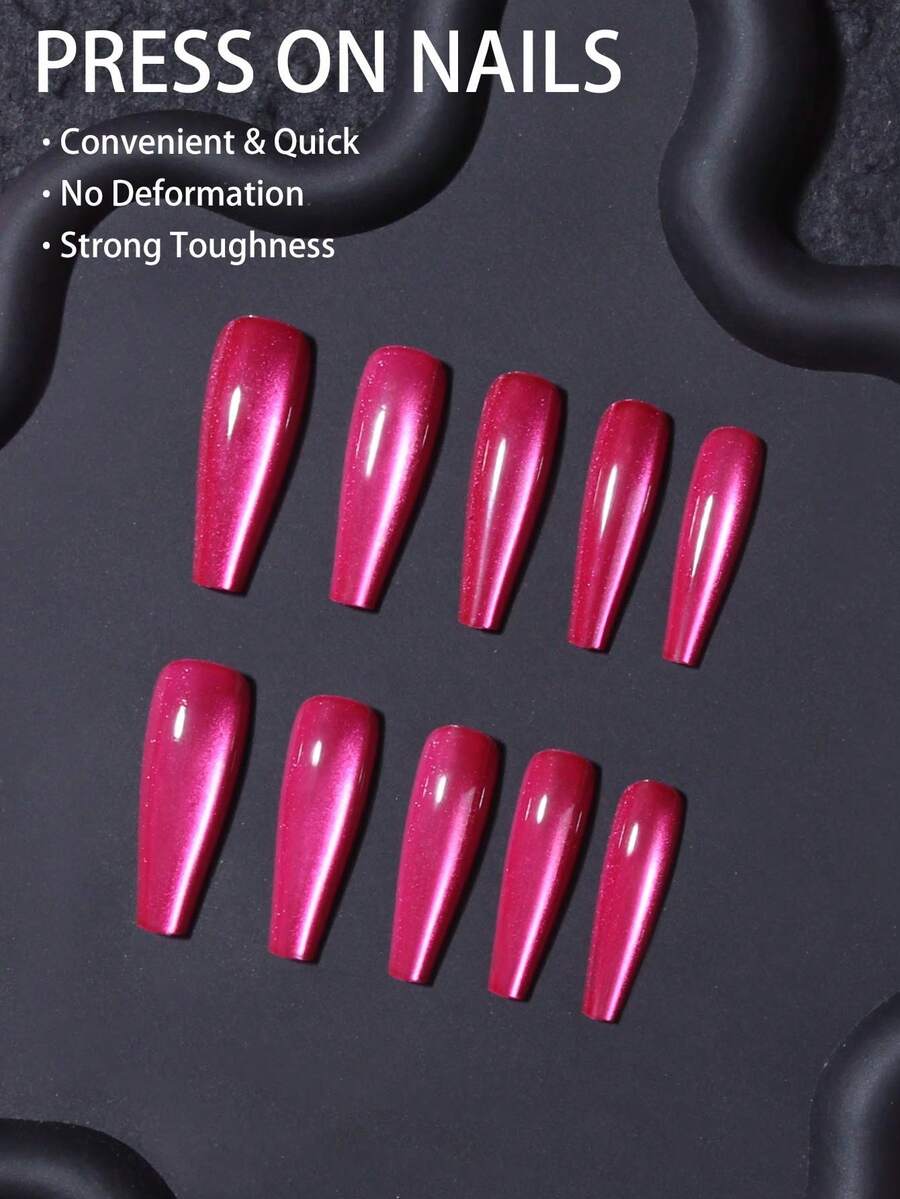 24pcs Long Coffin Red Cat Eye Press On Nails, Y2K Hot Pink Glossy Gradient Design, Acrylic Nail Set With Glue & File For Women Rave Look
