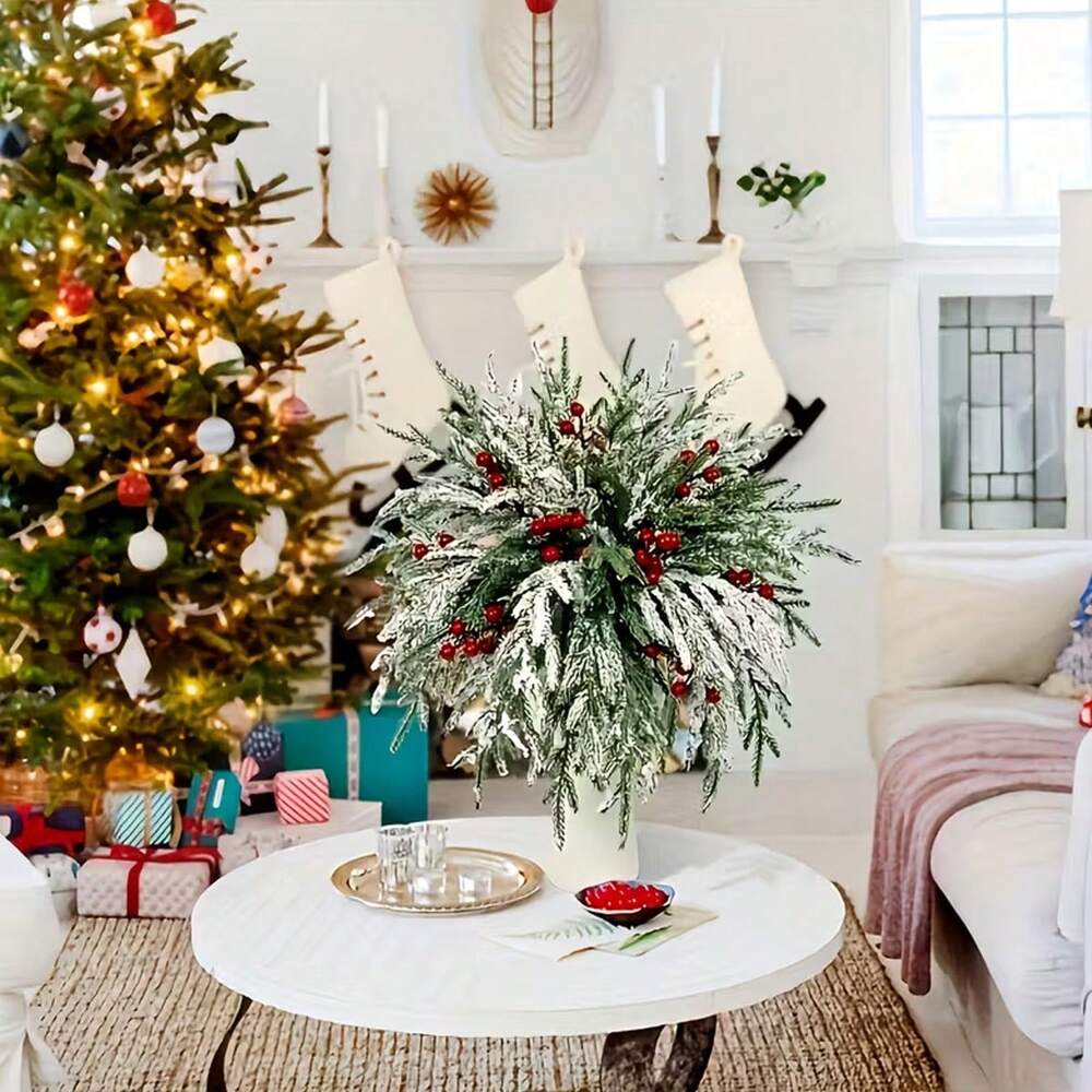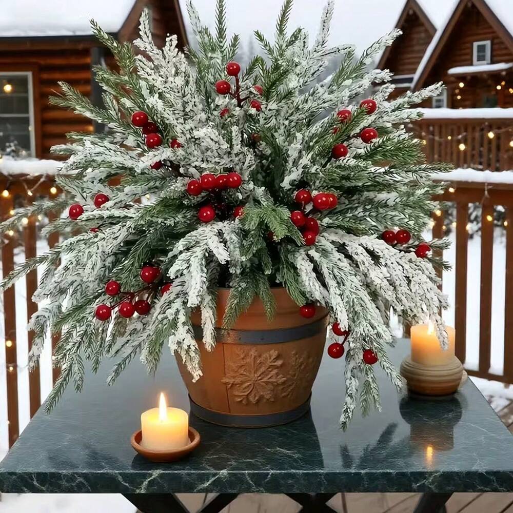 Artificial Pine Branches with Red Berries (2/10pcs), 14-Inch Realistic Greenery for Christmas Wreaths, Canes, Vases, and Holiday Tree Decorations