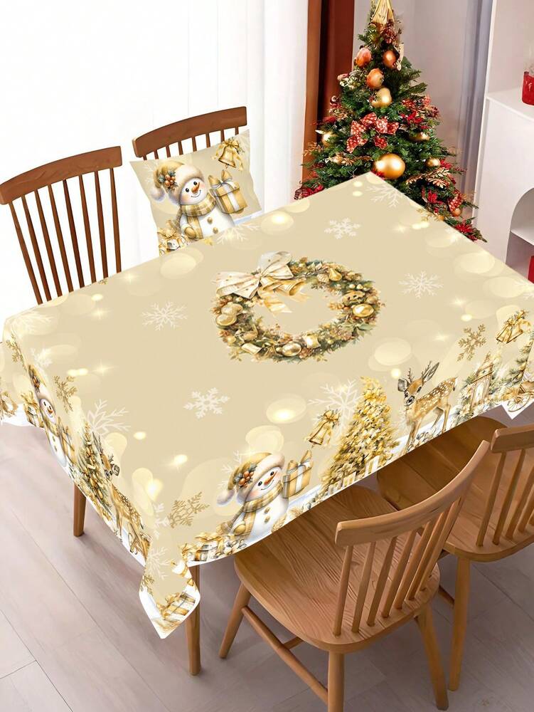 Festive Christmas Tablecloth with Snowman & Reindeer Wreath Design, Polyester Winter Table Cover for Dining Room & Kitchen Holiday Decor